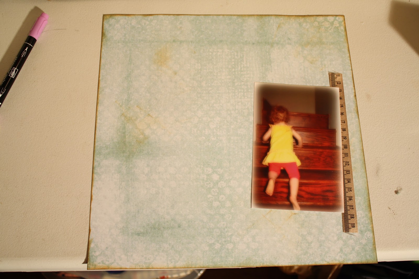 Following the basic guidelines from the sketch, I started putting my page together. I used dimensional foam adhesive to adhere the chipboard lettering, and double sided tape for the rest of the elements (I was out of Glue Dots!! Ahhh!!).